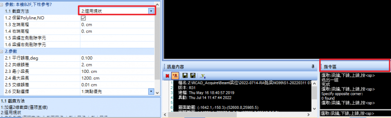 進入功能後,可於【參數1.1 截齊方法】選擇 2.逕用現狀,依指令區選取即可讀取弧梁。